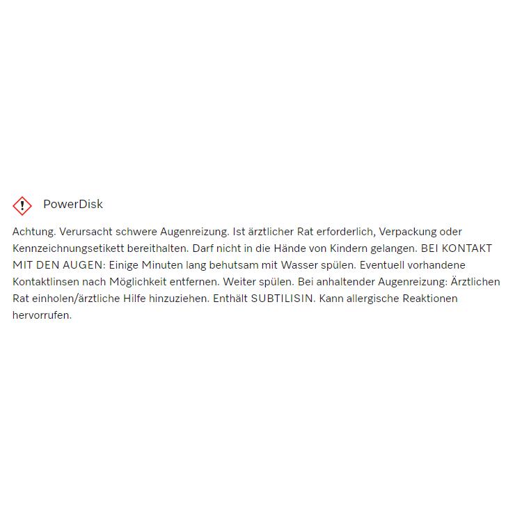 Das All in 1 Pulvergranulat der PowerDisk sorgt mit seinen leistungsstarken Enzymen und Zusatzfunktionen wie Klarspüler, Salz- und Glasschutz für eine zuverlässige und leichte Reinigung. Mit seiner Frischeformel sorgt es stets für angenehme Gerüche.