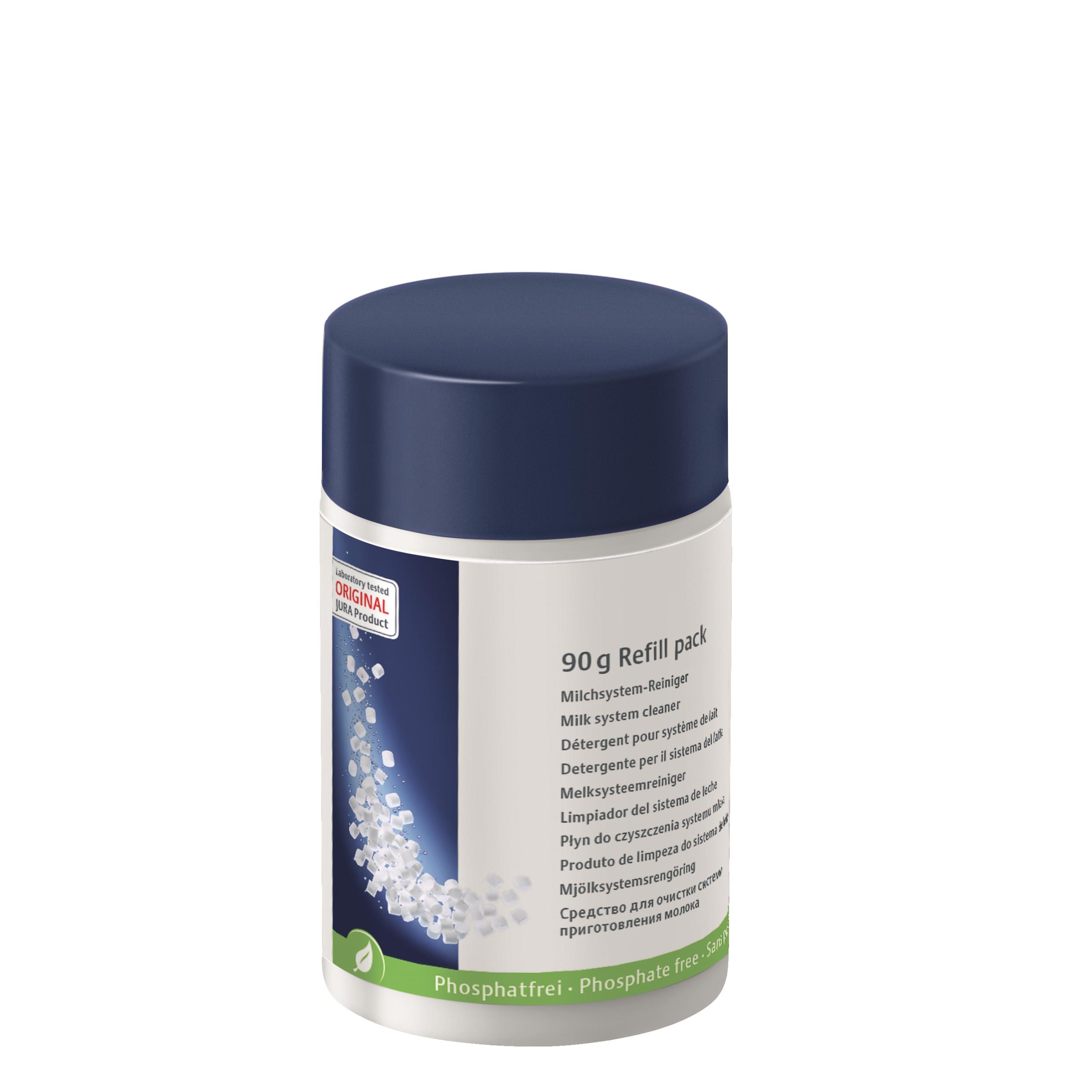 Weißer Refill-Behälter mit blauem und grünem Etikett. Auf dem Etikett steht „Milchsystem-Reiniger“ in verschiedenen Sprachen. Inhalt: 90g. Phosphatfrei.