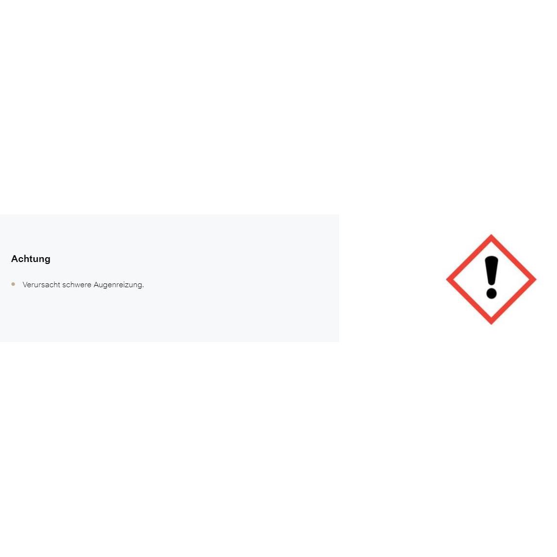 Warnsymbol: Gelber Hintergrund mit schwarzem Ausrufezeichen und Symbol für Augenreizung. Schrift: „Achtung, verursacht schwere Augenreizung“.