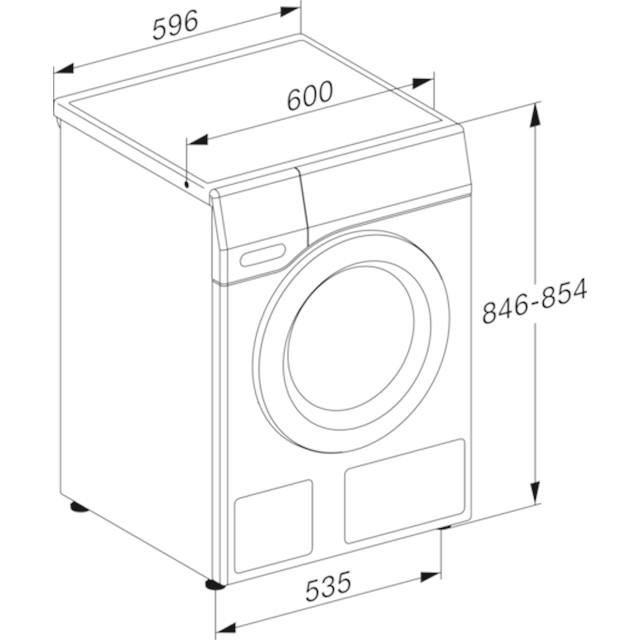 Waschmaschine, perspektivische Ansicht, mit Maßangaben für Höhe, Breite und Tiefe in Millimetern. Vorderseite mit runder Tür.