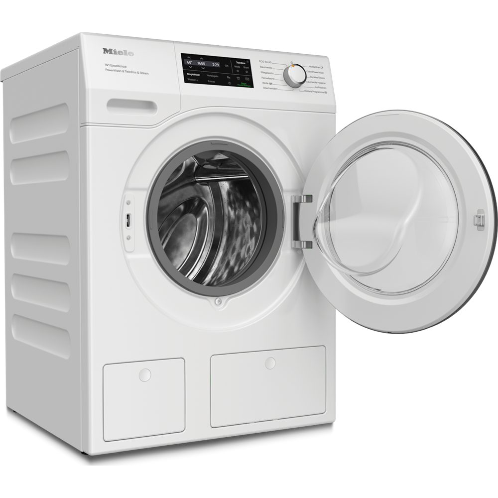 Weiße Frontlader-Waschmaschine „Miele W1 Excellence“. Digitales Display zeigt Waschprogramme, Temperatur und Restlaufzeit. Drehwähler rechts.