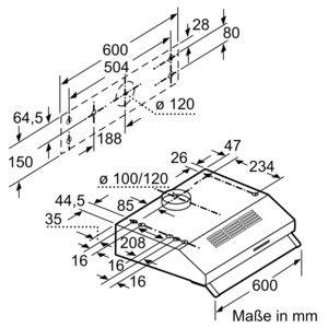 Technischer Umriss einer Dunstabzugshaube. Angegeben sind detaillierte Maße in Millimetern für Höhe, Breite und Tiefe.